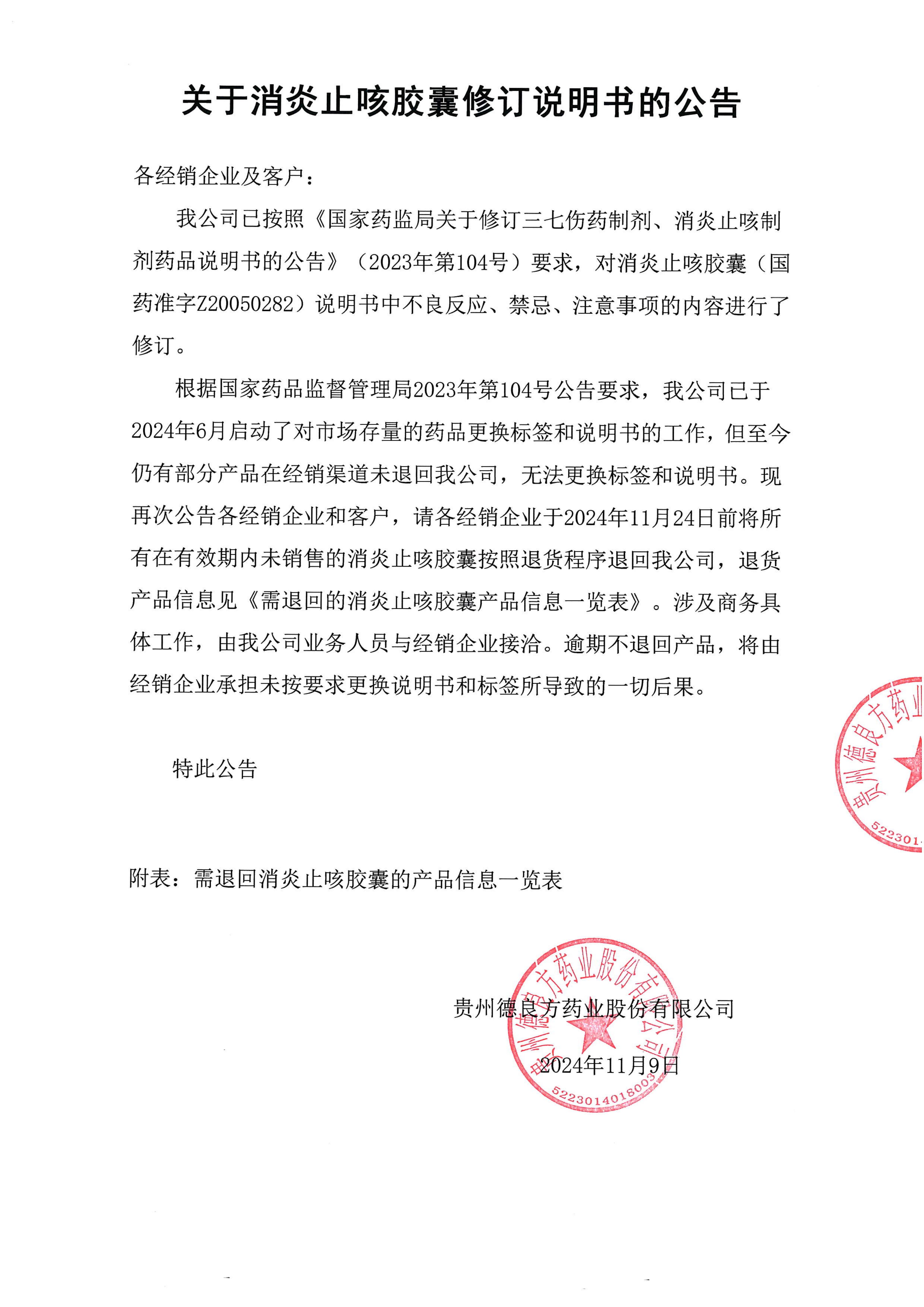 根據(jù)國家藥品監(jiān)督管理局2023年第104號公告要求,我公司己于2024年6月啟動了對市場存量的藥品更換標(biāo)簽和說明書的工作,但至今仍有部分產(chǎn)品在經(jīng)銷渠道未退回我公司,無法更換標(biāo)簽和所明書?,F(xiàn)再次公告各經(jīng)銷企業(yè)和客戶請各經(jīng)銷企業(yè)于2024絲年11月24日前將所有在有效期內(nèi)未銷售的止咳膠囊按照退貨程序退回我公司,退貨產(chǎn)品信息見 《需退回的消炎止咳膠囊產(chǎn)品信息一覽表》。涉及商務(wù)具體工作,由我公司業(yè)務(wù)人員與經(jīng)銷企業(yè)接洽。逾期不退回產(chǎn)品,將由經(jīng)銷企業(yè)承擔(dān)未按要求更換說明書和標(biāo)簽所導(dǎo)致的一切后果。